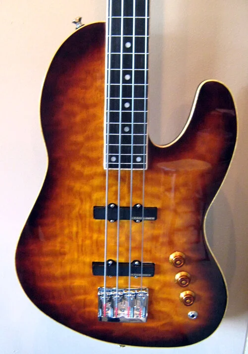 Custom-designed body with thru body maple and walnut fretless neck, quilted veneer top with dual jazz bass pickups.